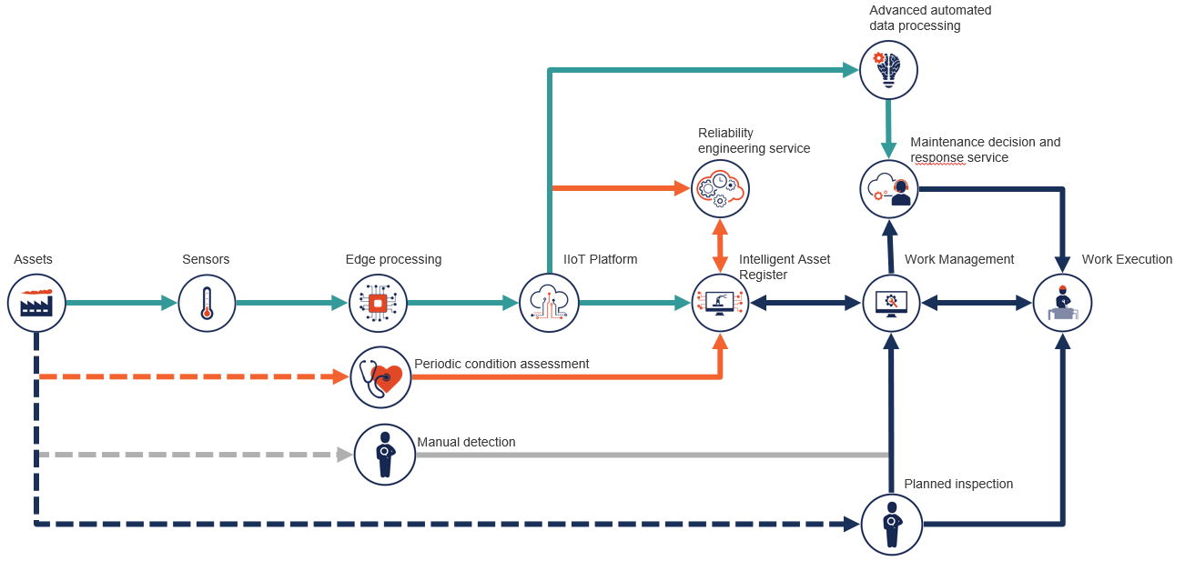 Visualising your asset management processes can also help determine how to deploy technologies in your operation. Below is a simple diagram depicting various scenarios from a planned inspection to a manual detection, periodic condition assessment, an IIoT enabled condition monitoring value chain, along with how each one feeds into the work or maintenance management process.