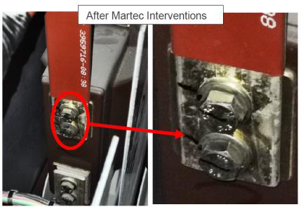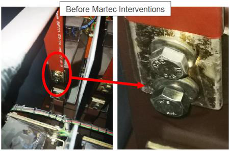 Online assessments were conducted in November 2019 and high risk levels were detected and assigned as Risk Level 5. Clear 3-phase contact discharges were identified using signal analysis. This indicated loose connections. An investigation was conducted in January 2020 during the next available shut down to locate and rectify the source(s) of the high discharges detected in this electrical network. The source of the discharges was found to be loose connections within a panel. These bolts were hand tightened and torqued and the high risk panel re-assessed to confirm if the repair was effective. Both panel and cable sections were merited as condition Level 2 after the repairs were conducted.